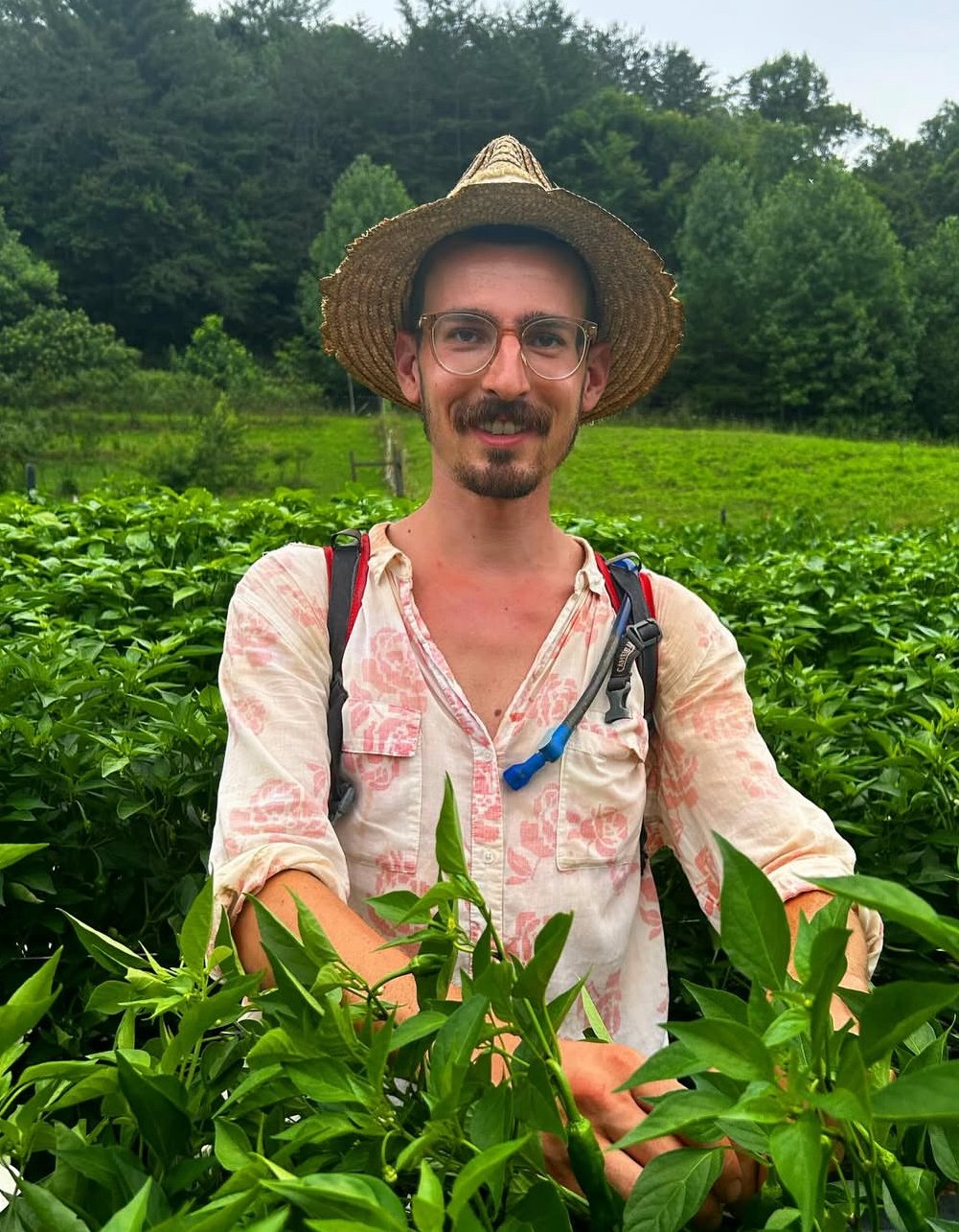 Hailing originally from central PA, Caling spent their early adulthood living on four continents and working in education, stage theater, political organizing, and construction. In the early 2020s they apprenticed at an organic vegetable farm in Connecticut and an education-based non-profit farm in Queens, NY, having fully caught the farming bug. What they love most about farming is the daily communion with plants and the relationships built with other folks attracted to the lifestyle — not to mention the fresh food! Highly motivated to integrate excellent regenerative growth practices with joyful queer expression and grassroots community building, they moved south to Millers Creek, NC for warmer weather and Blue Ridge mountainscapes, and have been cultivating community safe spaces based on unconditional friendliness, mutual aid, and spiritual and creative freedom. Their favorite vegetable to grow is the small but powerful garlic.